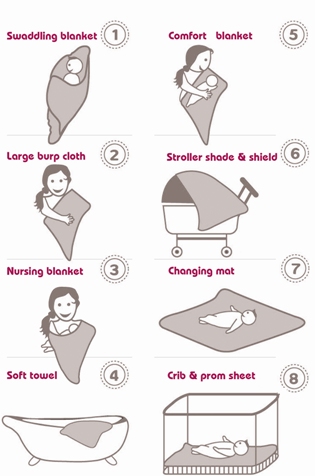 Η μεγάλη μας μουσελίνα μπορεί να χρησιμοποιηεί σα μαλακή κουβερτούλα, σαν πανάκι για το ρέψιμο, σαν κουβέρτα, σαν προστατευτικό κάλυμμα για το στρώμα ή το καρότσι.
