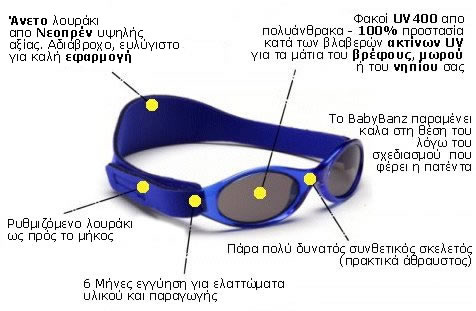 Με τα γυαλιά BabyBanz είστε σίγουροι ότι τα μάτια των παιδιών σας προστατεύονται καθώς η υψηλή ποιότητα φακών του - UV 400 - πληρεί τις υψηλότερες απαιτήσεις. Σχεδιάστηκαν στην Αυστραλία και συστήνονται από την " Ένωση Οπτομετρών" της Αυστραλίας.